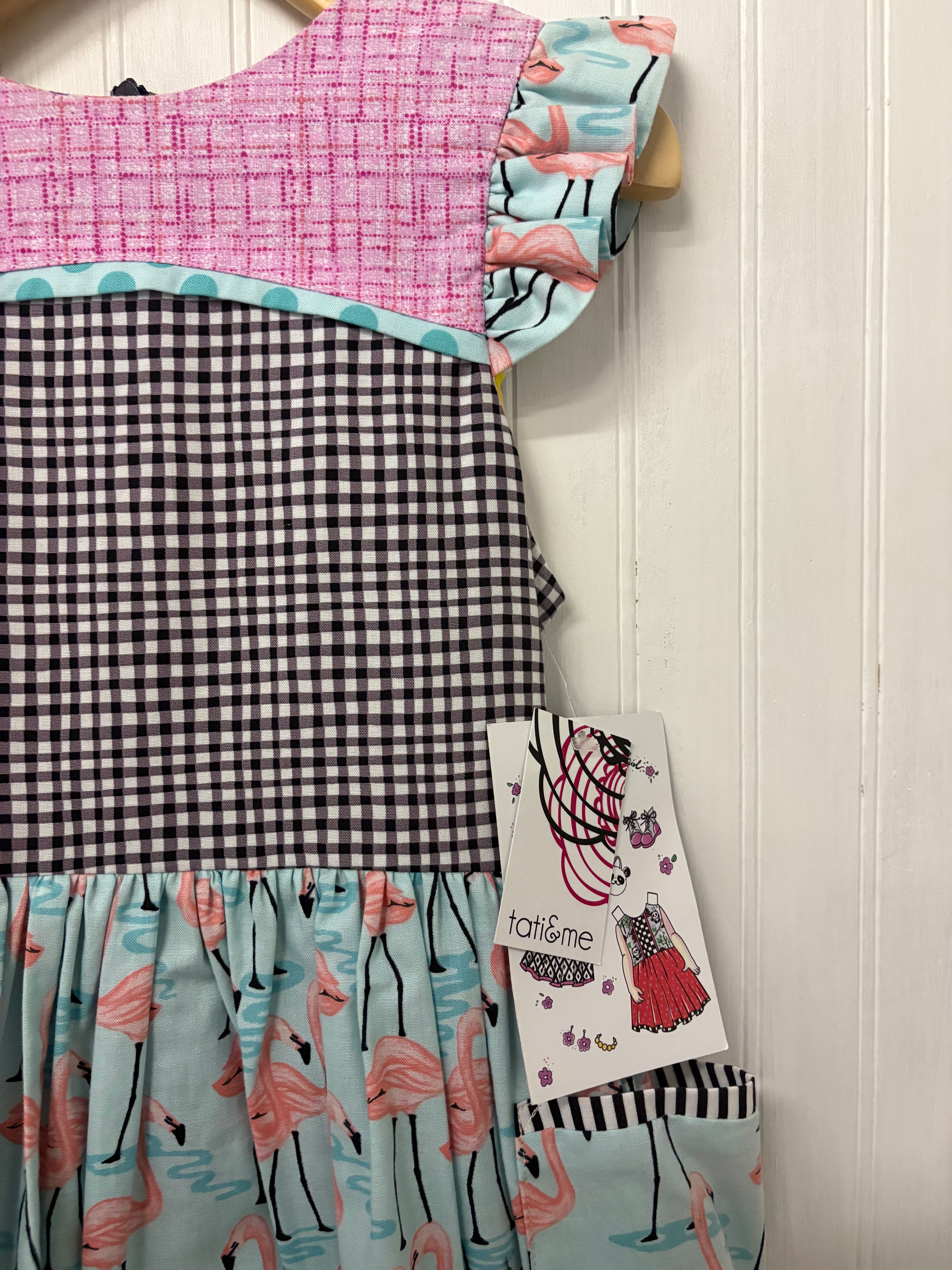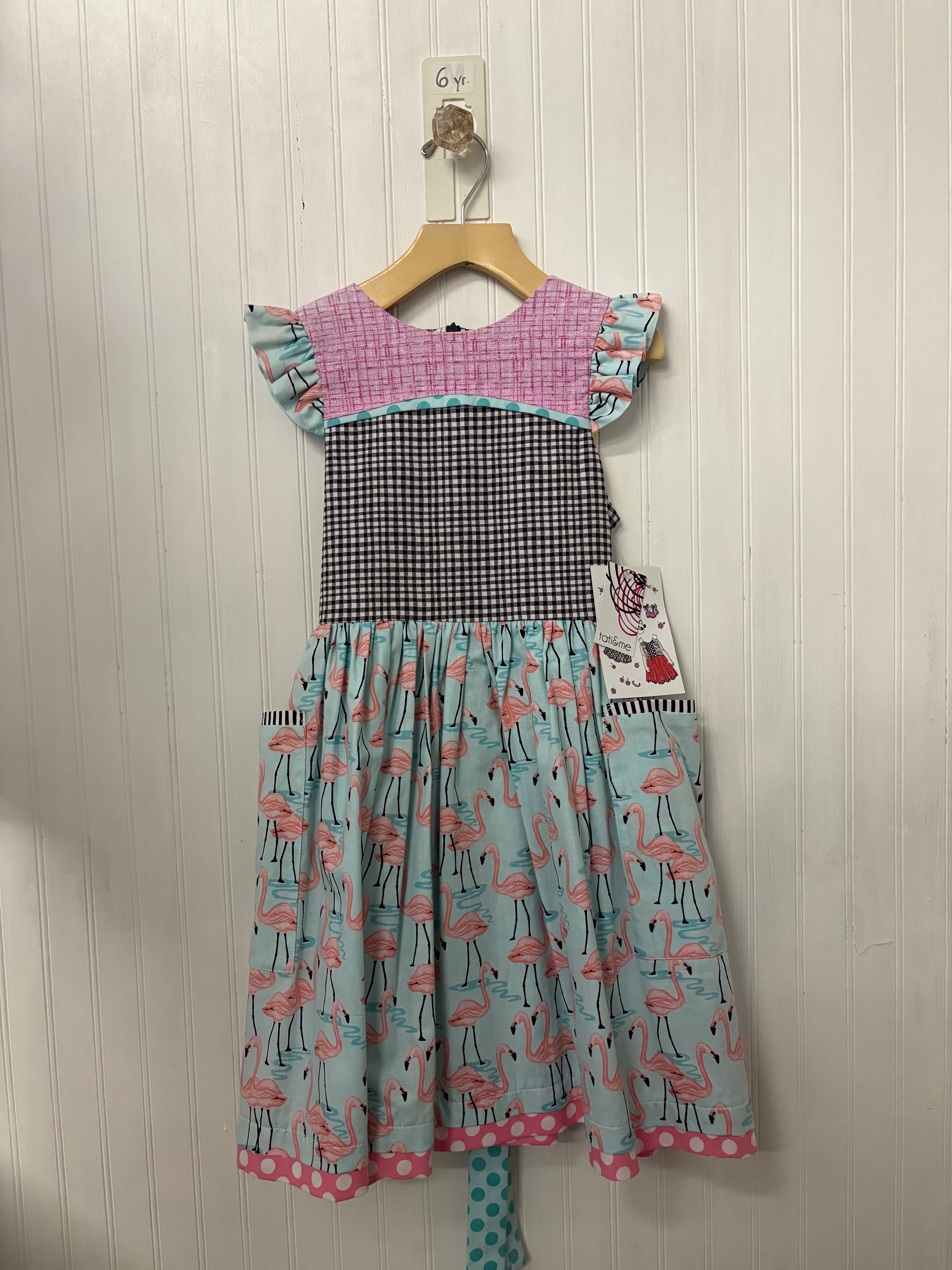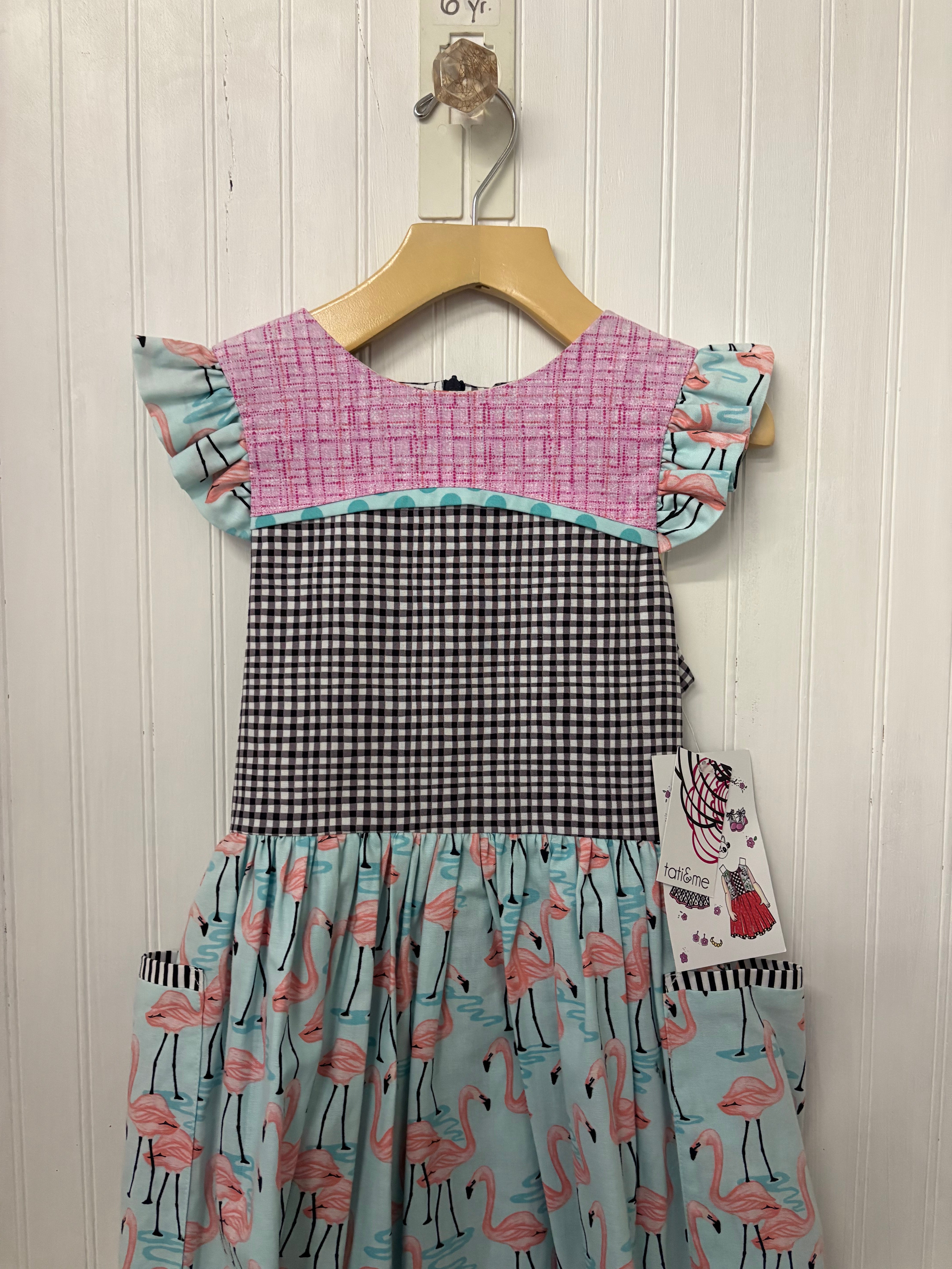 Boxy lined bodice with a center-back zipper & two side sashes to customize the fit. Handmade ruffles at the shoulder, pockets and a hem band add to the charm of the dress. Comfortable armholes to allow for movement and layering.